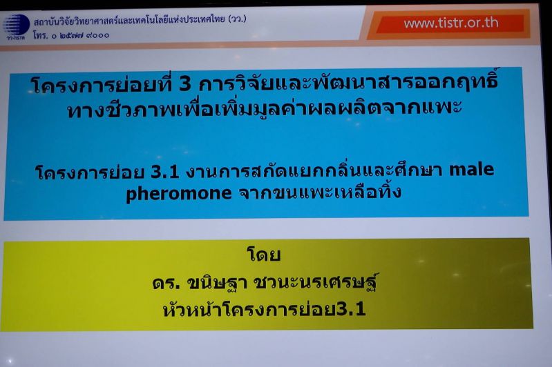 นางสาวขนิษฐา กล่าวต่อว่า ขณะนี้การวิจัยมีความคืบหน้าถึงการสร้างเป็นผลิตภัณฑ์น้ำหอม มีสารสกัดที่มีการทดสอบฤทธิ์ มีความพร้อมสูงที่จะนำไปเป็นส่วนประกอบของน้ำหอม เครื่องสำอางและผลิตภัณฑ์อื่น ๆ ที่เกี่ยวกับความหอม หรือทำเป็นผลิตภัณฑ์ปล่อยกลิ่นหอมระเหยและผลิตภัณฑ์มูลค่าสูงสำหรับตลาดเฉพาะกลุ่ม ซึ่งจะส่งผลกระทบที่ดีสู่ชุมชน สังคม สิ่งแวดล้อมและประเทศอีก โดยผลงานวิจัยชิ้นนี้.ถือว่า เป็นเจ้าแรกของประเทศและเป็นเจ้าแรกของเอเชียอีกด้วย โดยขณะนี้ได้พัฒนาเป็นผลิตภัณฑ์น้ำหอมประมาณ 9 กลิ่น เป็นกลิ่นสำหรับผู้หญิง 7 กลิ่น และกลิ่นสำหรับผู้ชาย 2 กลิ่น ซึ่งเป็นกลิ่นที่มีการพัฒนาแล้วและมีส่วนผสมของแพะที่มีสารฟีโรโมนอยู่ในนั้นด้วย นอกจากใช้ในน้ำหอมแล้ว ยังใช้ในครีม โลชั่น สบู่