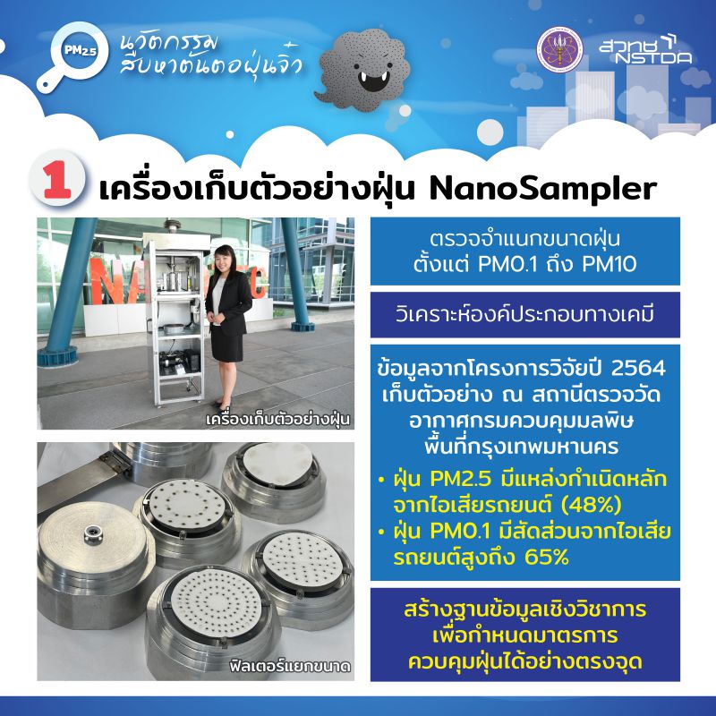 นวัตกรรมชุดนี้สะท้อนบทบาทสำคัญของ สวทช. ในการนำวิทยาศาสตร์ เทคโนโลยี และนวัตกรรม มาเป็นเครื่องมือหลักในการขับเคลื่อนการแก้ไขวิกฤตมลพิษทางอากาศของประเทศ ไม่เพียงเพื่อรับมือในระยะสั้น แต่เพื่อสร้างโซลูชันที่ยั่งยืนในระยะยาว นวัตกรรมชุดแรกมุ่งเน้นการสืบหาต้นตอของฝุ่น PM2.5 เพื่อให้การแก้ปัญหามีความแม่นยำ โดยนาโนเทค สวทช. ร่วมกับจุฬาลงกรณ์มหาวิทยาลัยและกรมควบคุมมลพิษ ได้พัฒนา "เครื่องเก็บตัวอย่างฝุ่น NanoSampler" ภายใต้โครงการวิจัย "การตรวจวิเคราะห์หาการกระจายขนาดและองค์ประกอบทางเคมีของฝุ่นละอองขนาดไม่เกิน 2.5 ไมครอน (PM2.5)" ที่ได้รับทุนสนับสนุนจากสำนักงานการวิจัยแห่งชาติ (วช.) ซึ่งสามารถแยกและวิเคราะห์ฝุ่นได้ถึง 6 ระดับขนาด ผลการศึกษาพบว่า เกือบครึ่งหนึ่งของฝุ่น PM2.5 ในพื้นที่กรุงเทพมหานครมาจากไอเสียรถยนต์ และในกลุ่มฝุ่นจิ๋ว PM0.1 มีสัดส่วนจาก ไอเสียรถยนต์สูงถึงร้อยละ 65 ข้อมูลดังกล่าวเป็นฐานสำคัญต่อการกำหนดมาตรการควบคุมมลพิษจากภาคคมนาคม อย่างตรงจุด นอกจากนี้ นาโนเทคยังมีการพัฒนา