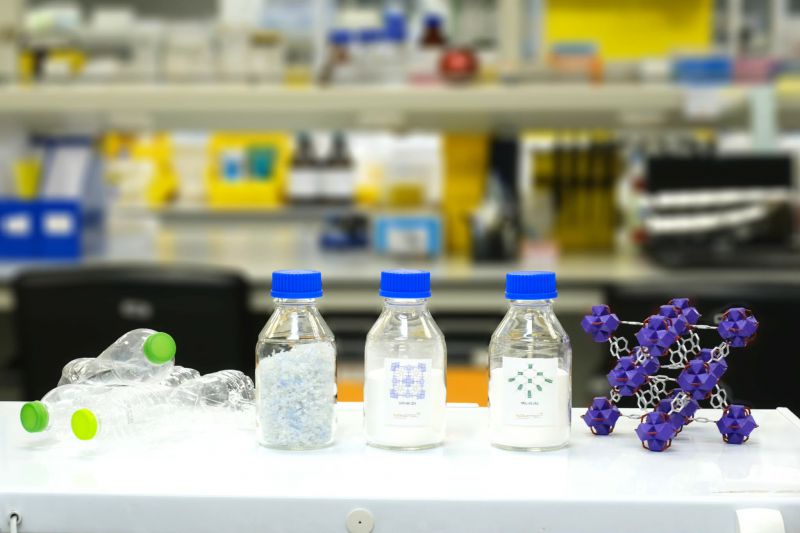 ตามมาด้วยวัสดุนาโนที่กำลังเป็นที่กล่าวถึงหลังคว้าโนเบลเคมี 2025 กับ "มอฟส์" (metal-organic frameworks: MOFs) ที่นาโนเทค สวทช. พัฒนาอย่างต่อเนื่อง หนึ่งในนั้นคือ การผลิต MOFs โดยใช้แนวคิดเศรษฐกิจหมุนเวียนเพื่อหมุนเวียนวัสดุเหลือใช้กลับมาใช้ประโยชน์ เช่น การย่อยสลายขวดน้ำดื่มพลาสติกเพื่อนำมาใช้แทนสารอินทรีย์ลิแกนด์ เป็นสารตั้งต้นสำคัญในการสังเคราะห์ MOFs หลายชนิดรวมถึงการสังเคราะห์ MOFs จากโลหะที่ได้จากของเสียอุตสาหกรรม เช่น mill scale จากอุตสาหกรรมเหล็ก และโลหะจากน้ำยากัดแผงวงจรพิมพ์ พร้อมออกแบบการขึ้นรูป MOFs ในหลากหลายรูปแบบเพื่อให้เหมาะสมกับการประยุกต์ใช้จริงในอุตสาหกรรม เช่น การขึ้นรูปเป็นเม็ด การเคลือบบนวัสดุรองรับ (support) และการขึ้นรูปเป็นเมมเบรนในลักษณะแผ่นหรือท่อกลวง ซึ่งช่วยให้ MOFs สามารถนำไปใช้งานได้สะดวก มีความทนทาน และมีประสิทธิภาพในการดูดซับหรือกรองสารปนเปื้อนได้ดียิ่งขึ้น ทั้งสำหรับดักจับก๊าซคาร์บอนไดออกไซด์, สารระเหยอินทรีย์ (VOCs) และไนโตรเจนออกไซด์ (NOx) ซึ่งเป็นก๊าซมลพิษสำคัญต่อสิ่งแวดล้อมและสุขภาพของมนุษย์ รวมถึงการดูดซับยาปฏิช